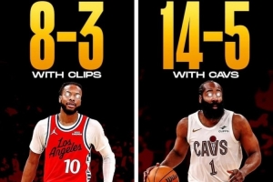 哈登出战时,骑士队14胜5负。