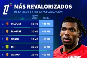 法甲球员德转身价上涨榜:雅凯+3500万欧居首,埃梅里+1000万欧
