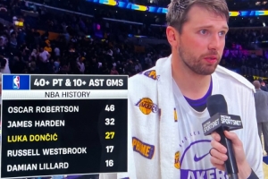 据统计,这是东契奇生涯第27次至少40分10助攻,历史第三多,仅次于大O(46次)和哈登(32次)。