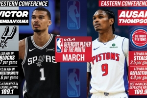 体育资讯4月3日讯 NBA官方公布了3月份的东西部月最佳防守球员,马刺的文班亚马和活塞的奥萨尔·汤普森分别当选。