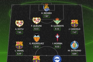 WhoScored西甲第30轮最佳阵:亚马尔、奥尔莫、坎塞洛在列