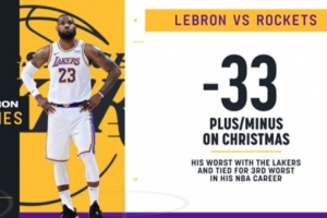 ESPN晒出数据显示,圣诞大战打火箭-33的正负值是詹姆斯湖人生涯最差,也平了其个人生涯第三差。