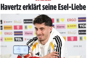 哈弗茨:“是的,我对驴的喜爱一直存在。具体来说,我就是喜欢驴子。我不知道这种感情是怎么产生的。大概在我很小的时候,不知怎么就喜欢上了驴子。队友们也知道这件事,有些人还会拿这件事开玩笑。对我个人来说,动物保护一直是非常重要的议题。我非常喜欢动物,家里养了三只狗。我们在德国也有驴子。总的来说,驴子是特别棒的动物。”